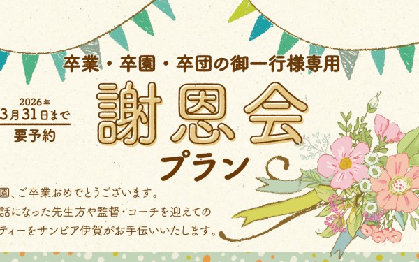 謝恩会プラン2026 期間限定 3月31日(火)まで プラン内容 お世話になった先生方や監督・コーチを迎えてのパーティーをサンピア伊賀がお手伝いいたします。ソフトドリンク飲み放題付きで、お一人様税サ込3,500円~。 宴会 お料理内容はお問い合わせください。 2時間会場費無料 マイク2本貸し出しサービス 花束手配サービス(実費ご負担) 無料送迎 伊賀市内1か所 有料道路代ご負担 要予約 要予約 3日前までに ご予約・お問合せ 0595-24-7000(代表)